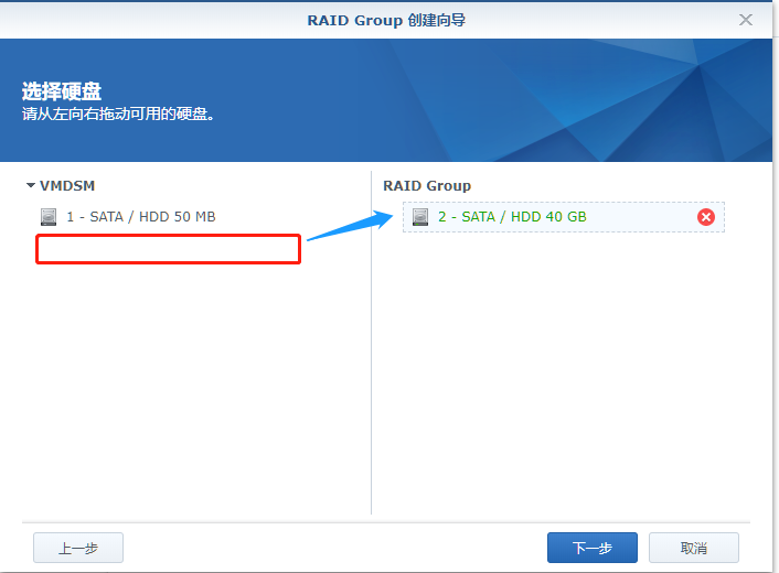选择该阵列模式下的硬盘,本文为虚拟机演示Basic 只需要一块那么将分配好的40G硬盘按住拖动入RAID Group中