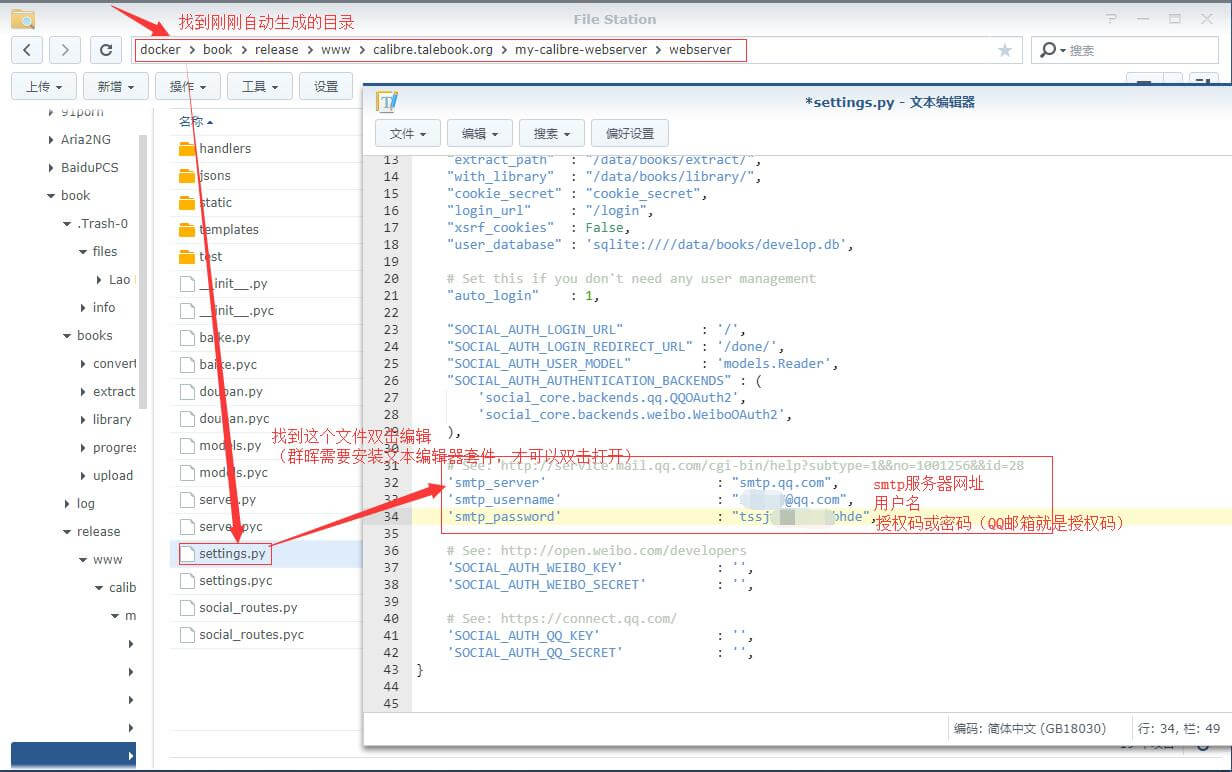 九、编辑settings.py,将你自己的smtp地址、用户名、密码都填写进去,保存文件(如果双击不能打开,需要安装群晖套件——文本编辑器。或者通过SMB/WEBDAV等方式连接后修改)