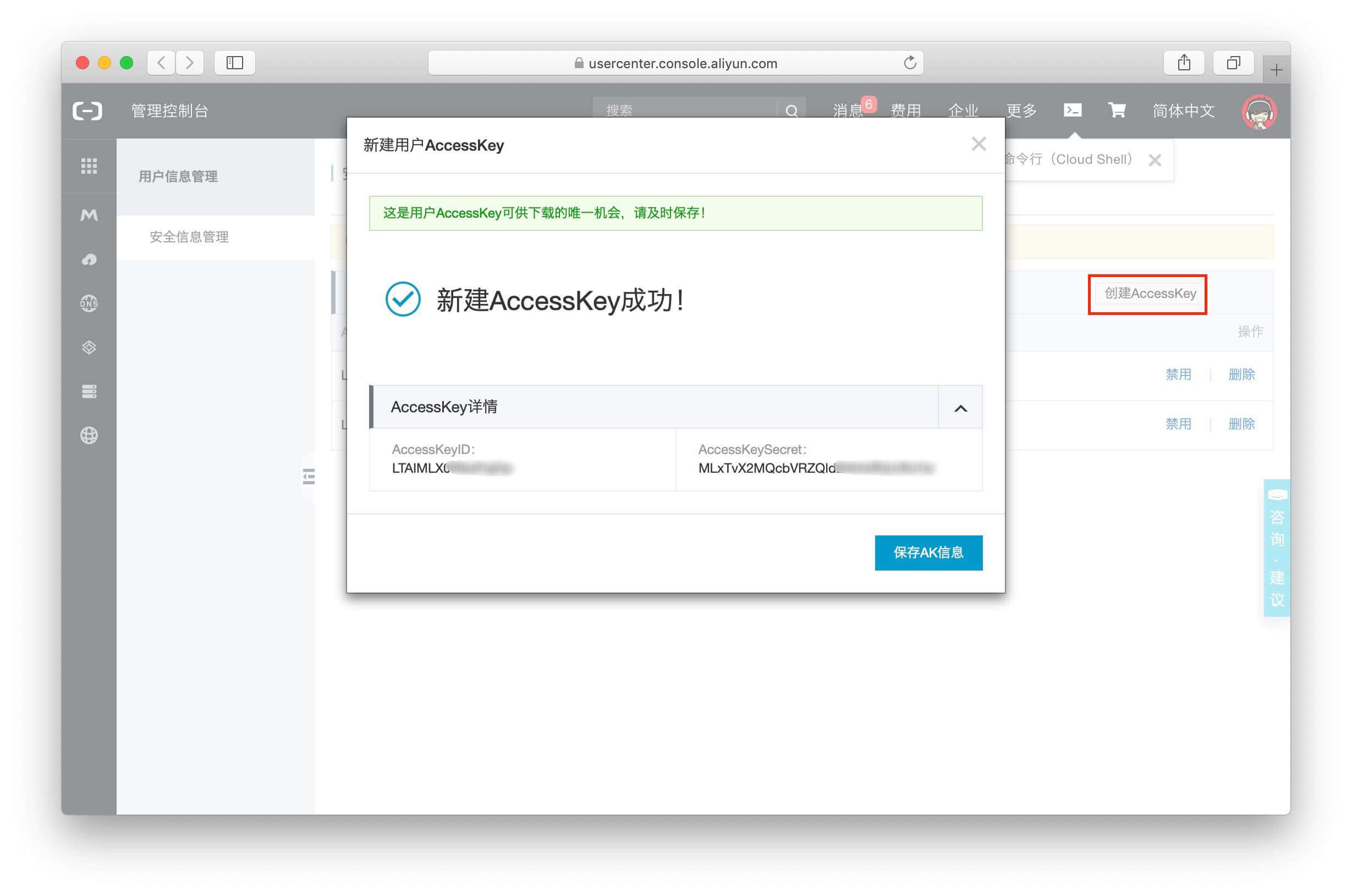 请及时复制保存AccessKey信息