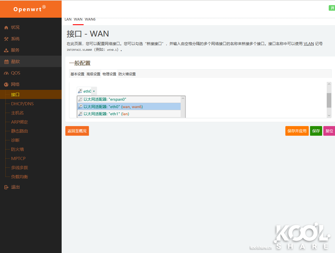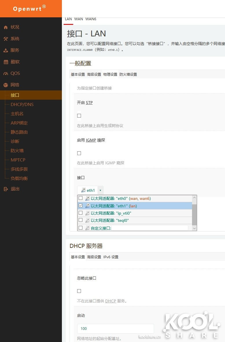 在LEDE内部,我将eth0分配给wan,eth1分配给lan