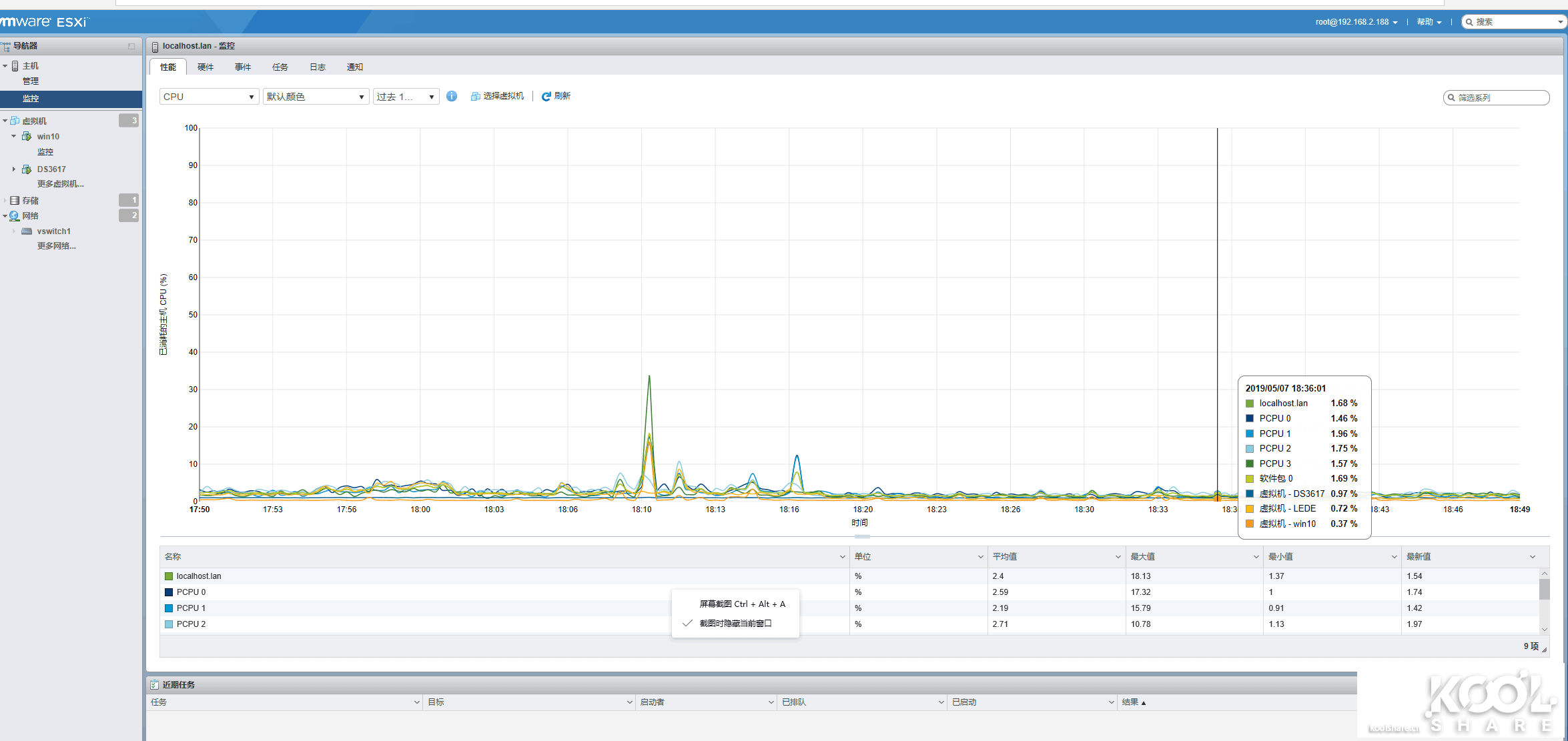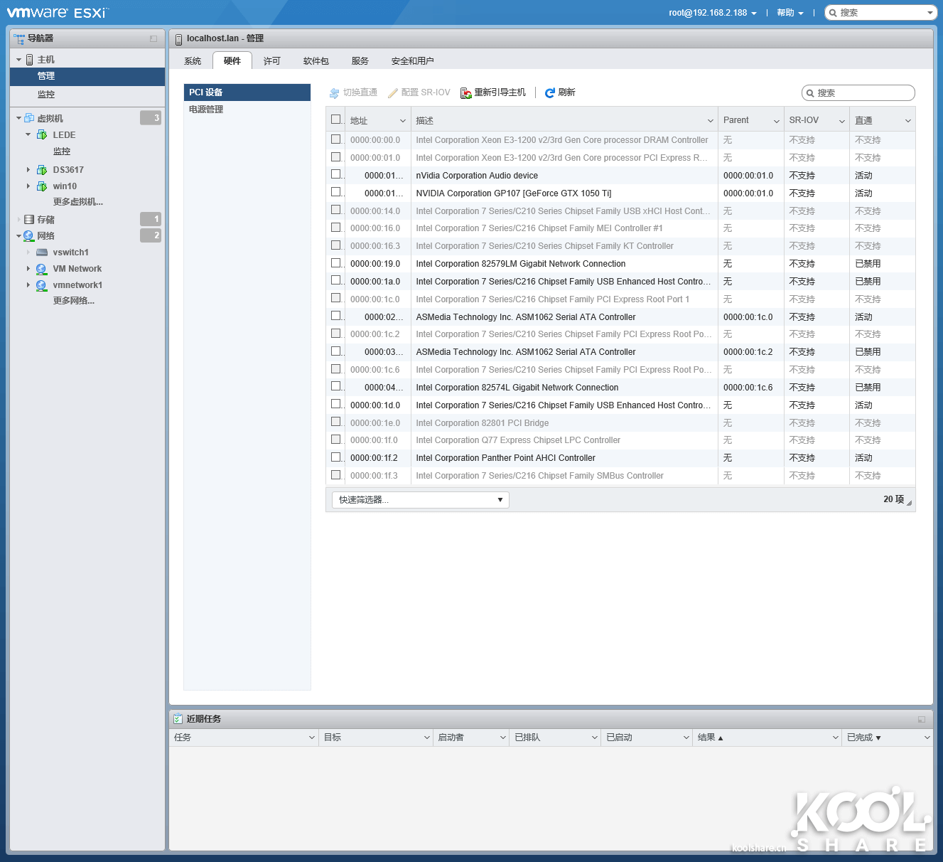 3,原本认为WAN的那个网口直通就行了,试验了后发现直通后能工作,但是CPU占用一直居高不下,查esxi后台情况(ssh下输入esxtop命令)得知,这个直通的口一直在向上层要dhcp地址。遂改回虚拟交换机,得以恢复。