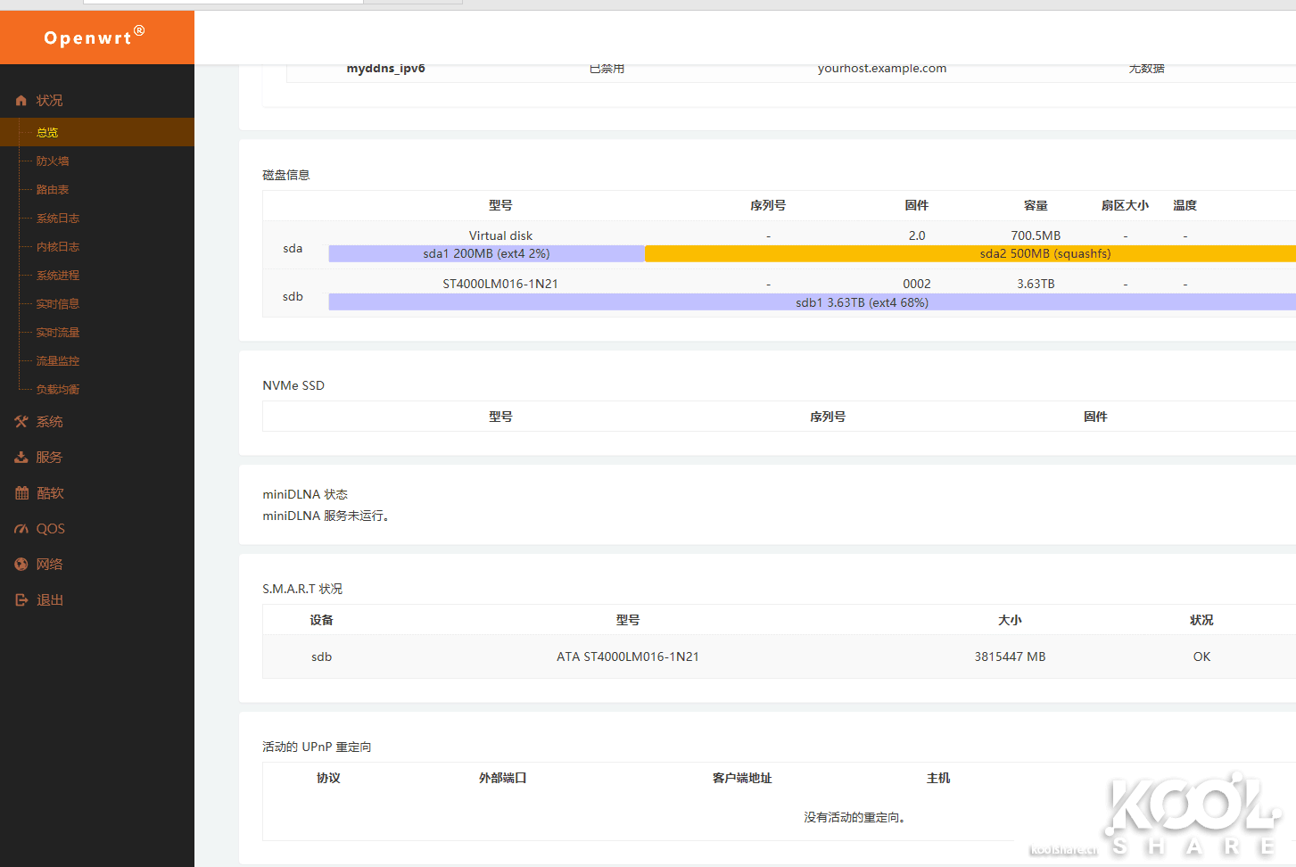 装好后,RDM直通一块硬盘给LEDE就行了,然后在LEDE里面挂载即可。