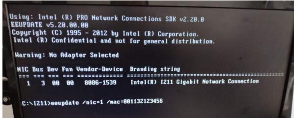 (3)执行eeupdate /nic=1 /mac=001132123456 命令, 将网卡1的MAC地址修改为00-11-32-12-34-56。