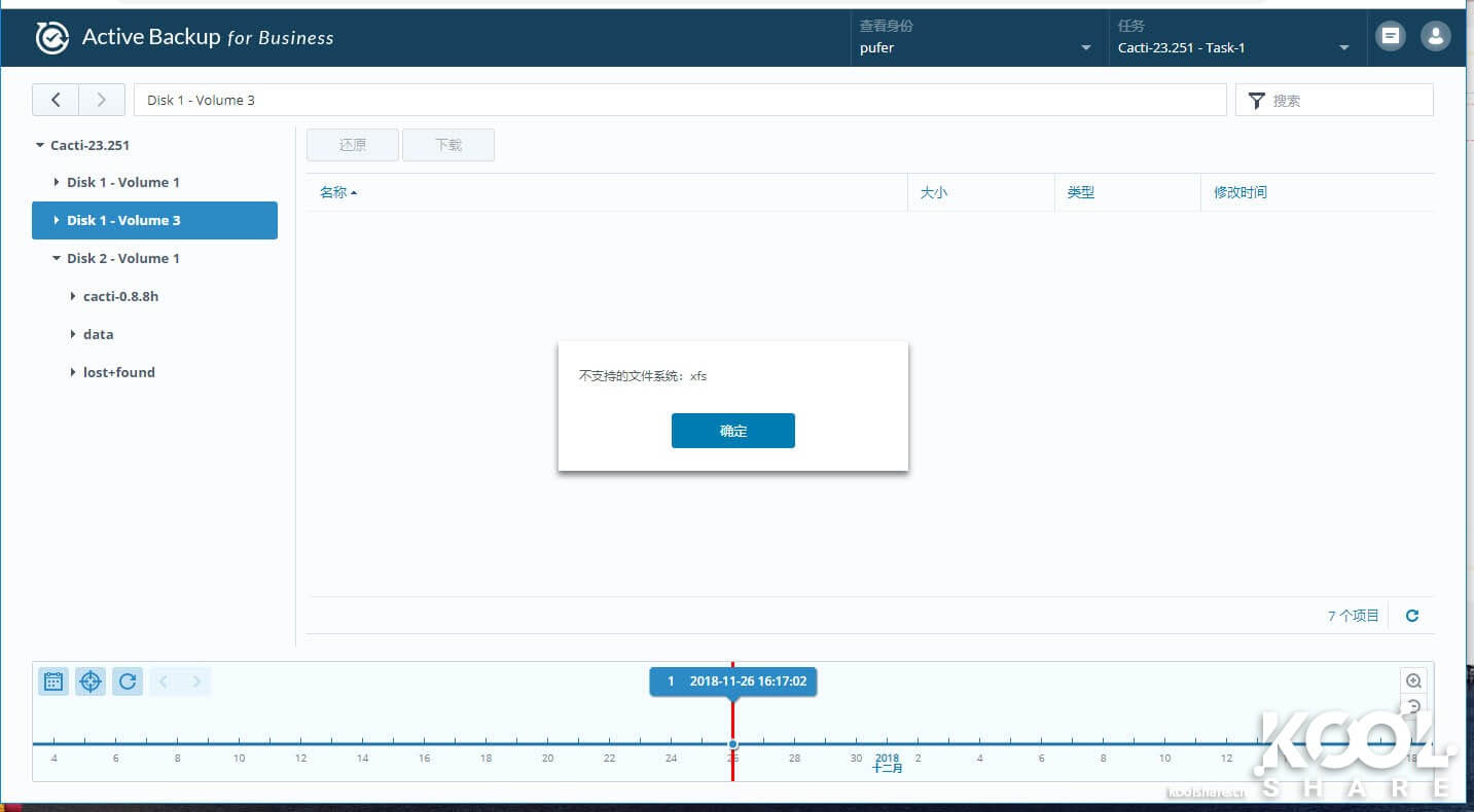 由于不支持CentOS 7中默认使用的XFS文件格式,Active Backup for Business无法看到部分磁盘镜像内的数据。