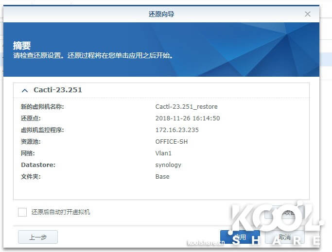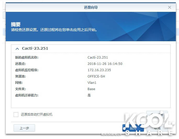这些设置基本和克隆一台虚拟机类似,并且Active Backup for Business正确的读取了vSphere中的信息。确认后开始虚拟机还原。