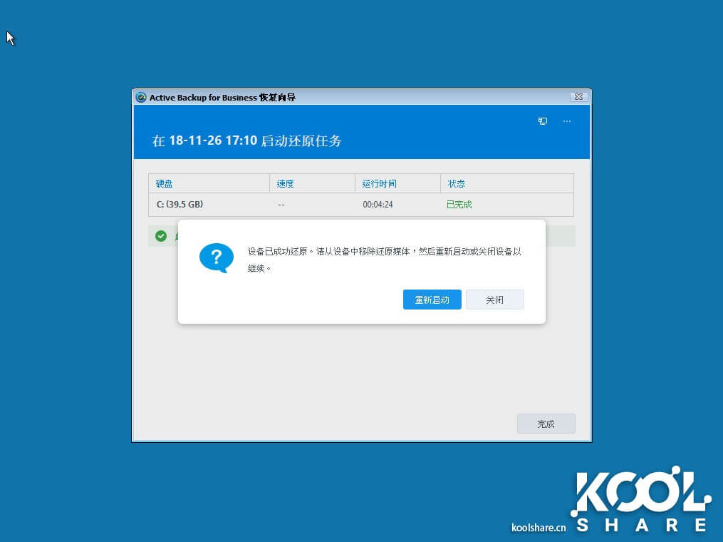 如果选择覆盖,直接给用户确认信息,然后Active Backup for Business就开始还原,还原后自动开启虚拟机。