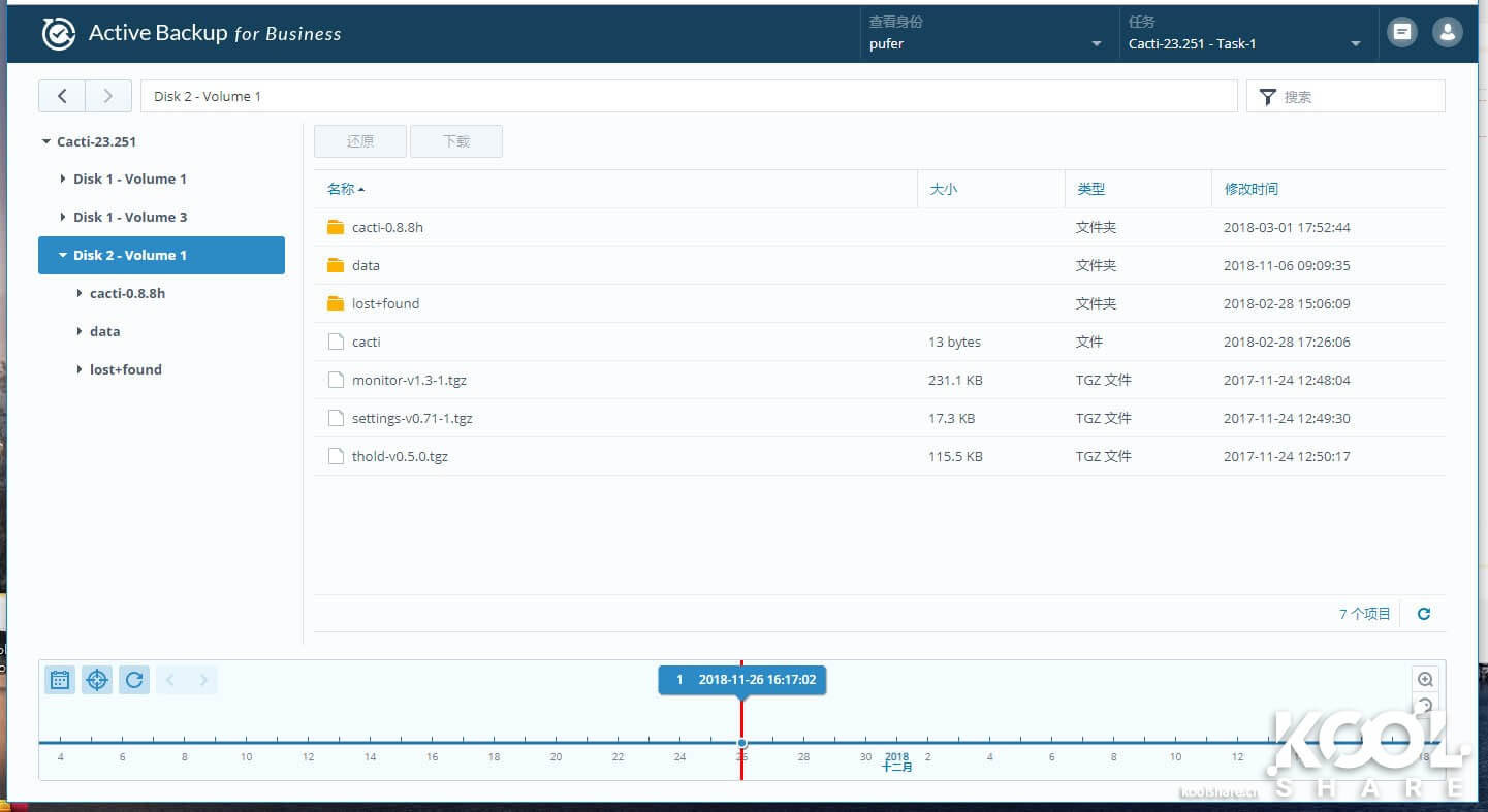通过时间线,可以选择备份,选中一个文件可以选择下载历史版本,或者直接还原。