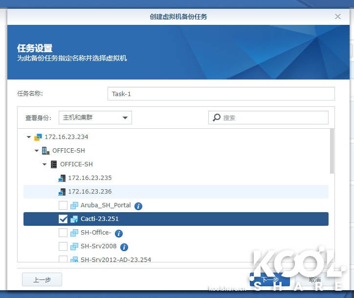 选择要备份的虚拟机 ,这里正确的读取了vSphere中的集群设置,把多台宿主机上虚拟机合并显示。勾选要备份的虚拟机。安装VMTools的虚拟机可以安全的进行快照备份,没有安装的会有提示信息。