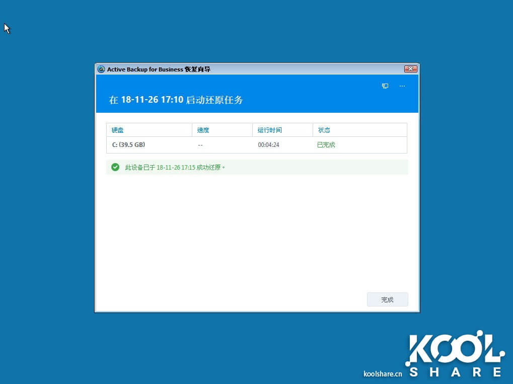 我们来开始第一次备份,Agent会显示当前正在备份和备份进度。第一次备份26G的数据,大概使用了10多分钟。Active Backup for Business的备份速度是相当的快。