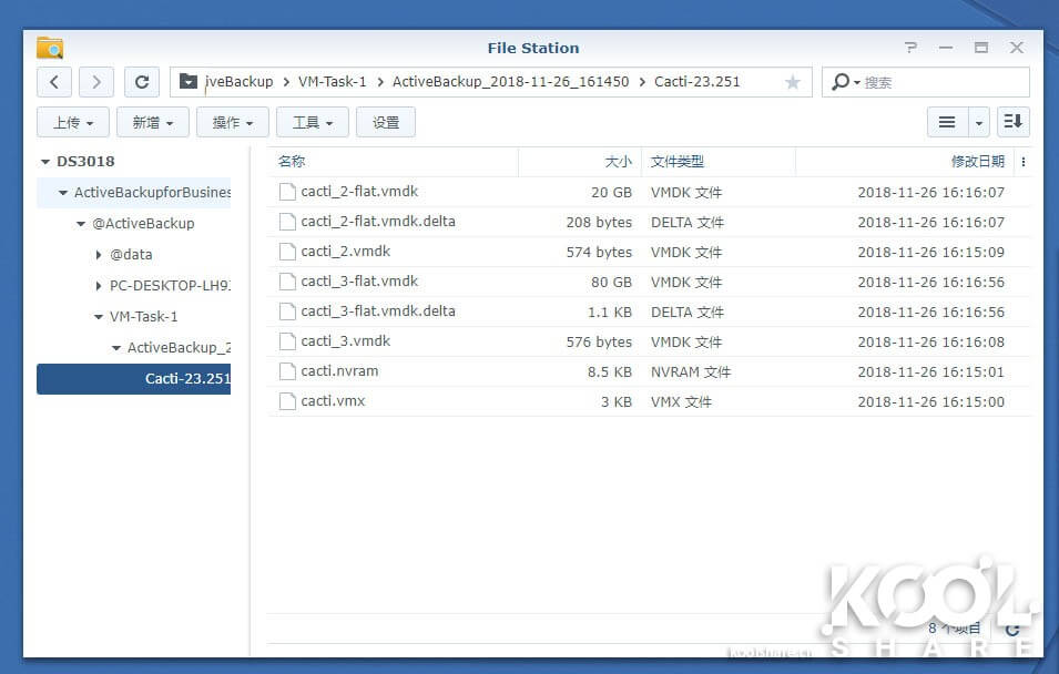 这里我们看一下File Station下备份下来的文件,是以vmdk形式保存。即使VMWare崩溃,也能方便使用这些文件手工恢复虚拟机。