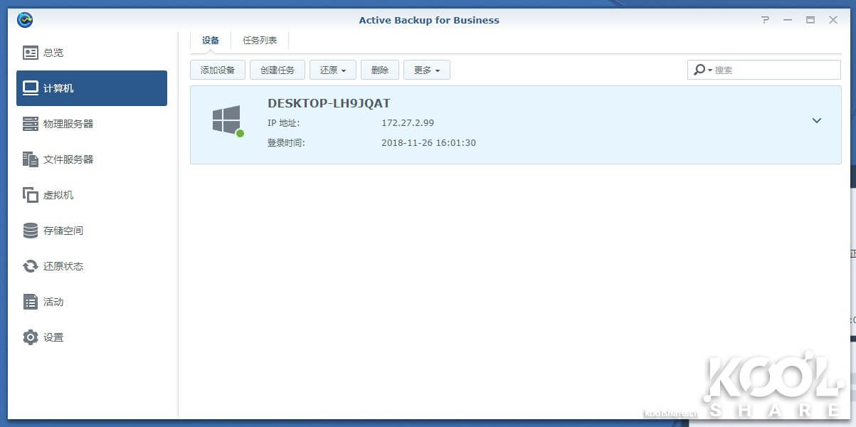 连接完成后Agent会做一个自动的默认配置,剩下操作都在群晖上完成。这种简单化的部署,对于企业IT来说非常方便的。在客户端安装完Agent后,就可以在群晖界面统一管理了。