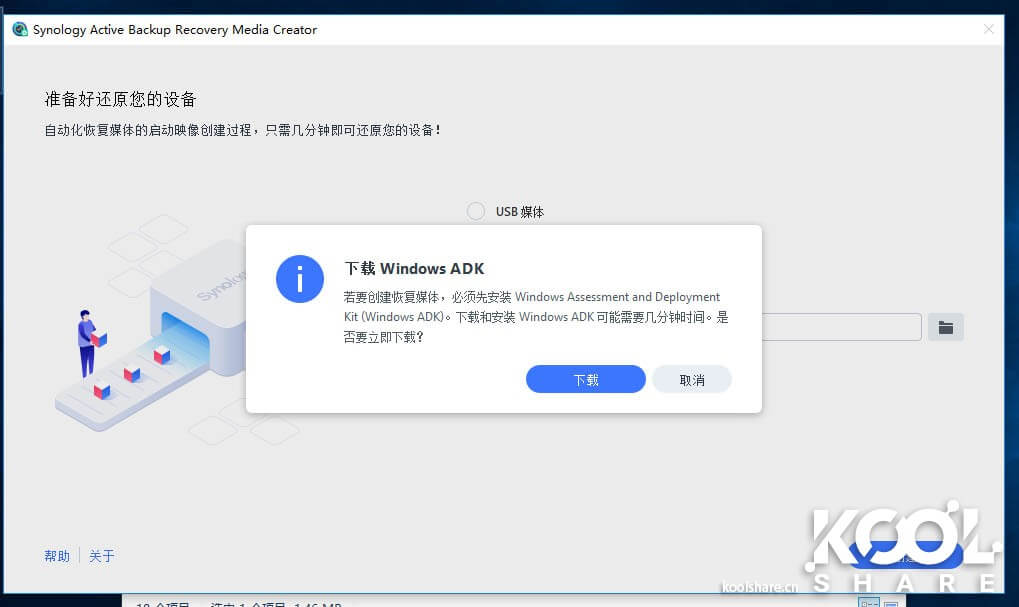 工具提示需要安装Windows ADK用于创建PE环境,我们点击下载,自动下载开始安装。