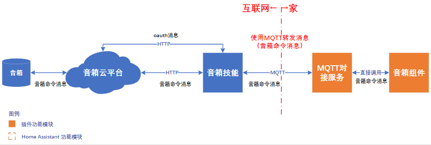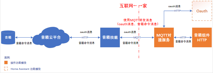 MQTT对接服务配合本人搭建的mqtt中转服务,可以将音箱云平台的音箱命令消息、oauth消息转发到无公网环境下家中的Home Assistant。