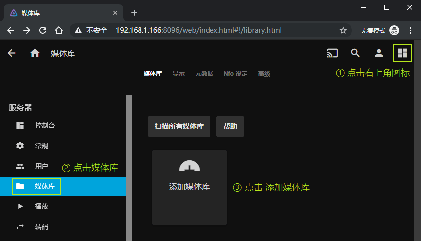 1. 点击右上角的图标,接着点击“媒体库”,点击“添加媒体库” 。