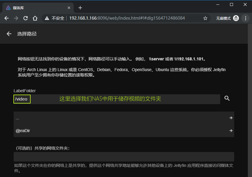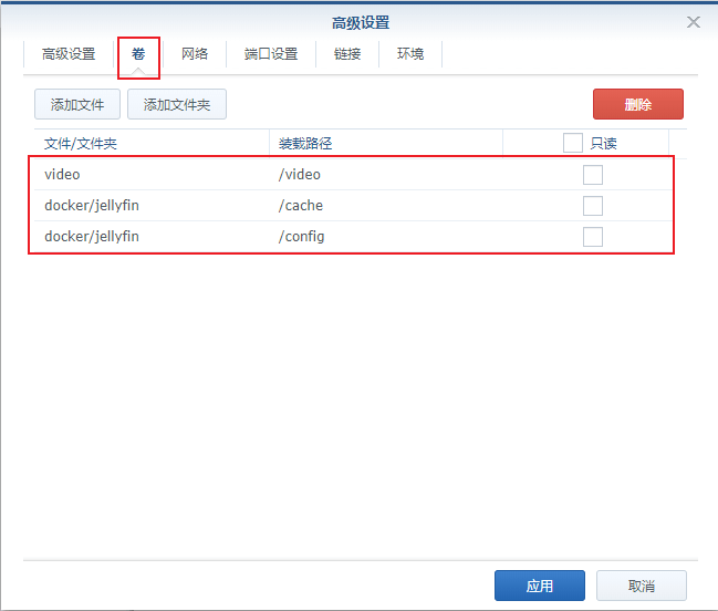这个步骤就是我们之前说的,将NAS的文件夹装载到容器中,video文件夹是用作媒体的储存,docker/jellyfin 指定了两次,是因为配置文件和缓存我们放在一起就可以啦。