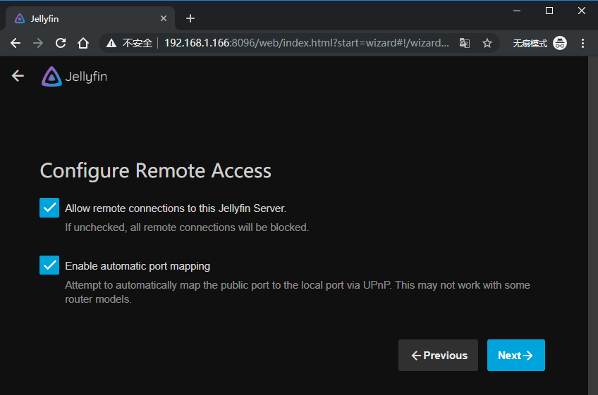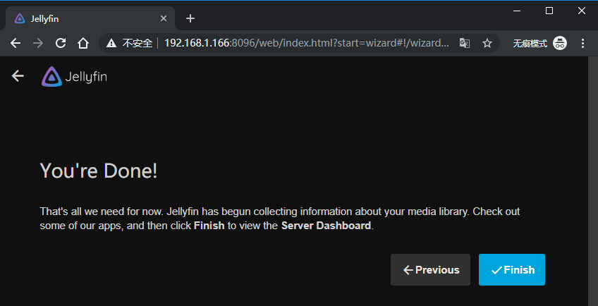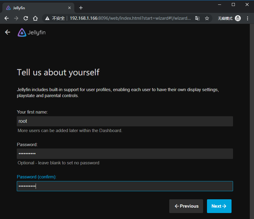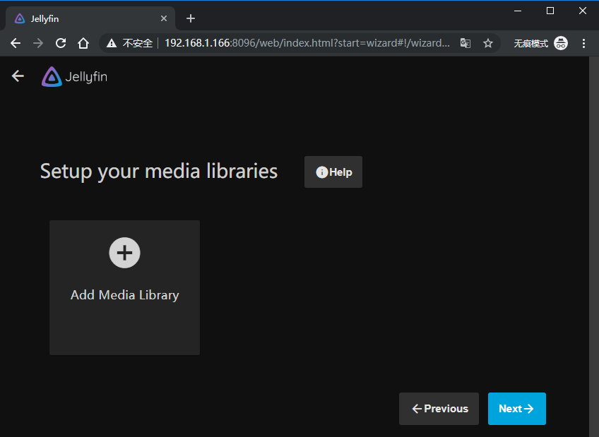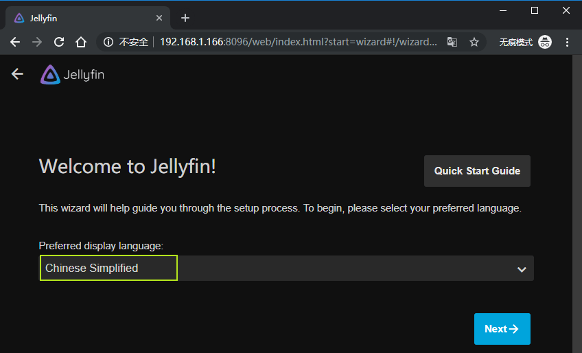 接下来,我们通过通过浏览器打开:内网的IP+8096端口 没错你看到的就是Jellyfin的初始化页面。我们按照我下图提示的步骤一步一步设置,并且一步一步点击“Next”就可以啦。过程很简单照做即可。