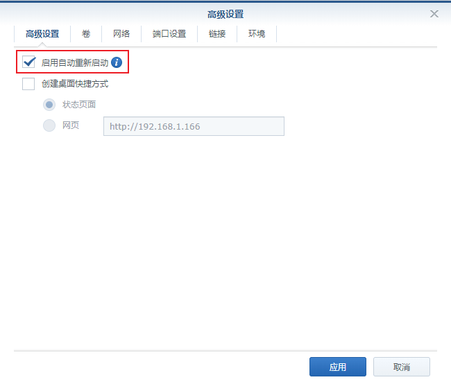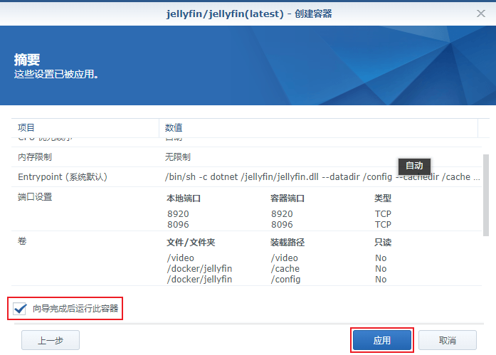 7. 上面的所有步骤都搞定之后,我们勾选“向导完成后运行此容器”,并点击“应用”