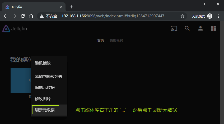 4. 回到主页,就可以看到你刚刚添加的媒体库了。但是如果里面还没有看到影片?那么确定你把影片已经放到NAS的video文件夹中了。如果还是没看到?不要紧,我们点击“刷新元数据”就可以啦。