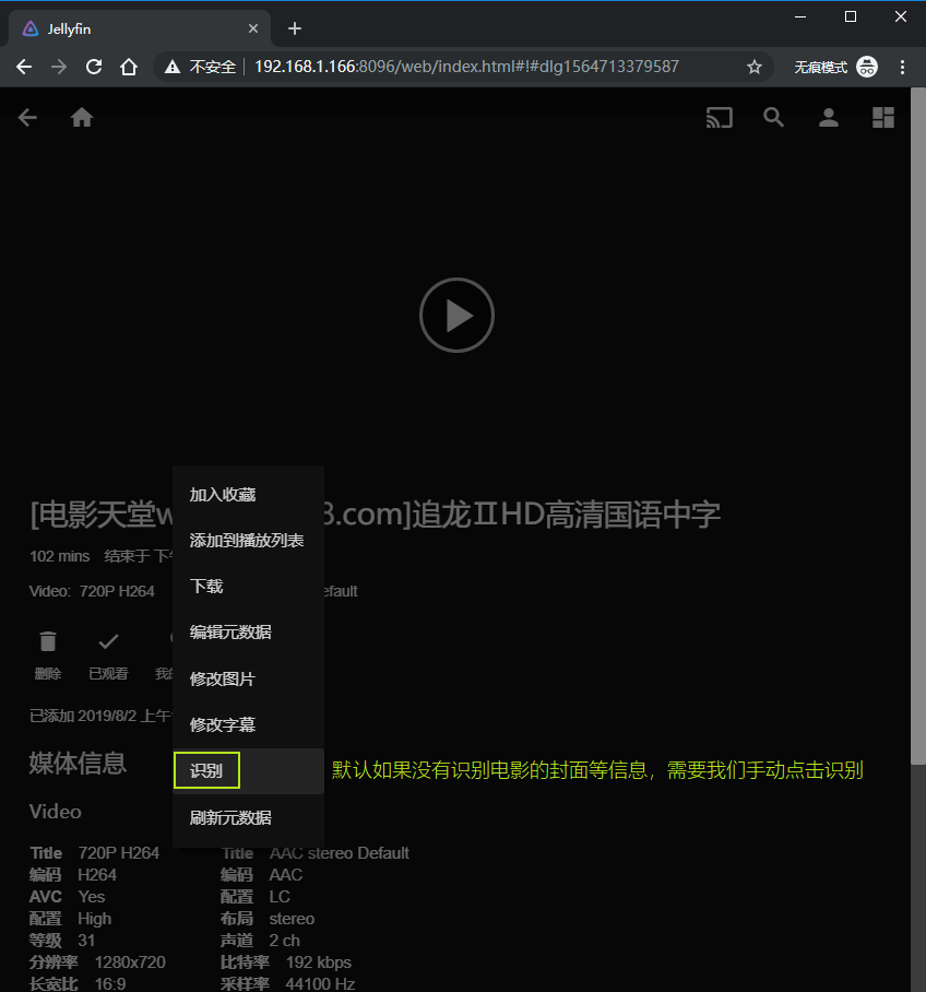 5. 电影是加载出来了,但是没有封面怎么办?点击影片的“识别”,并录入电影名字就可以选择封面咯。