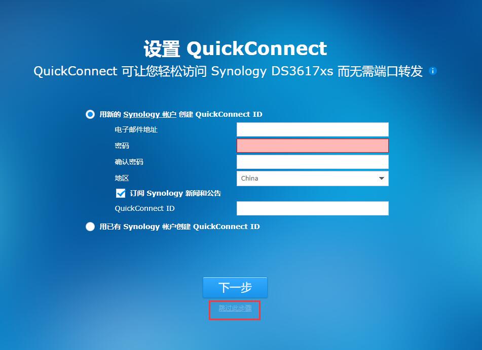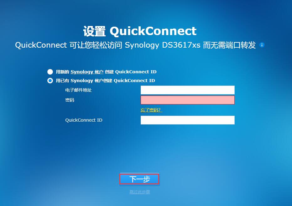 (2)如果你是买官方机器的白群用户,并且已经已经有QC账号,可以选择“用已有synology账户创建QuickConnect”,在这输入原有QC的ID;