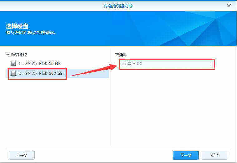 65、把左边的磁盘2 - SATA/HDD 200GB,用鼠标点住不放手,并且拖动到右边存储池的“所需HDD”区域,松开鼠标;