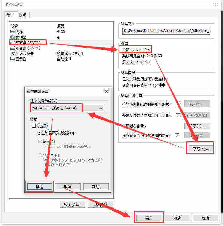 43、此时,我们需要验证一下,确保那个50MB的磁盘是SATA 0:0(如果不是SATA 0:0,则需要自己调整),确认无误后就确定,保存生效;