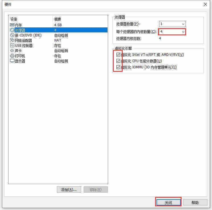 8、根据电脑的配置情况,给群晖虚拟机分配cpu核心,本文以4核为例,并且在三个虚拟化的选项全部打勾;