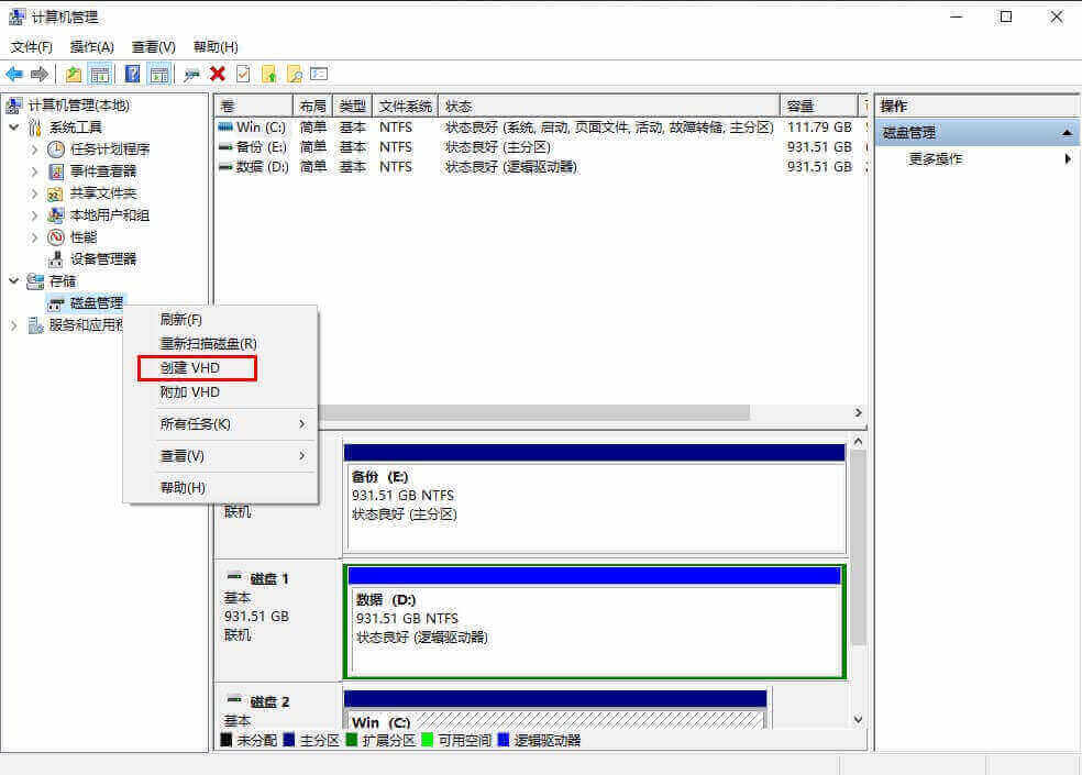 23、回到win系统的磁盘管理,找到刚才新建的那个50MB的磁盘,右键,分享VHD;