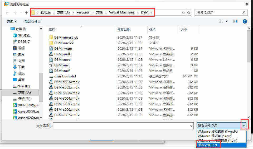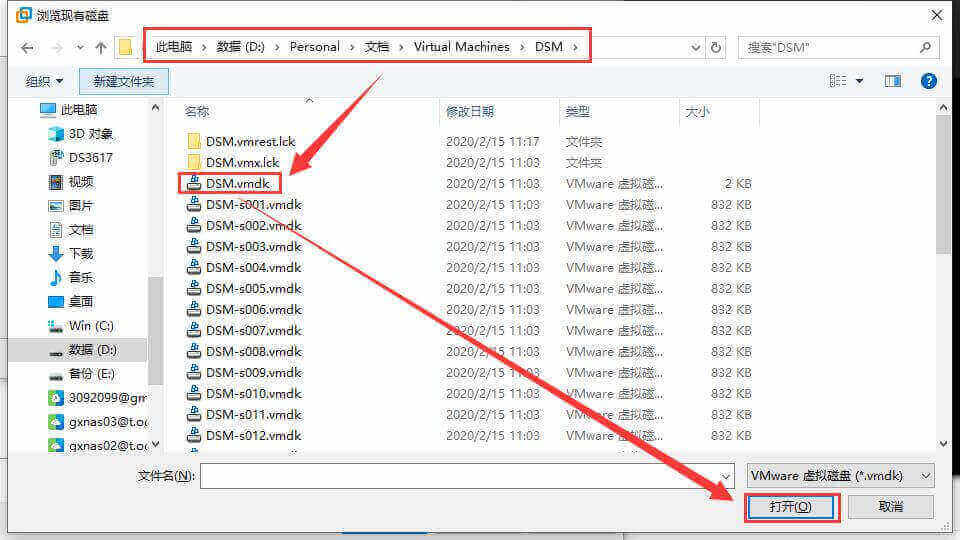 41、找到第4步、第5步我们添加的200G的虚拟磁盘:DSM.vmdk,打开;
