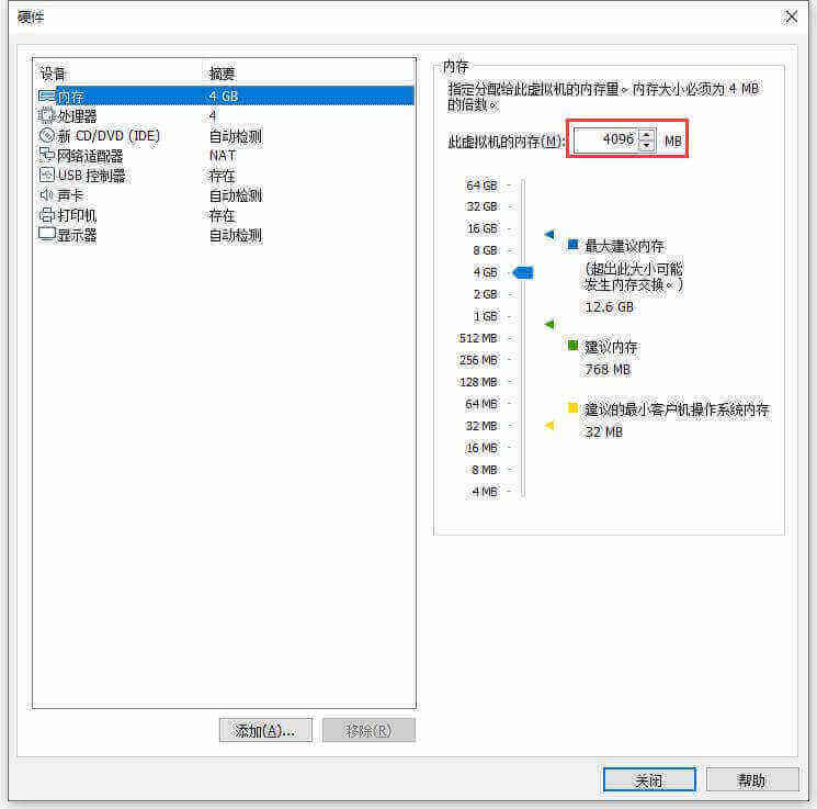7、根据电脑的配置情况,给群晖虚拟机分配内存,本文以4G为例;
