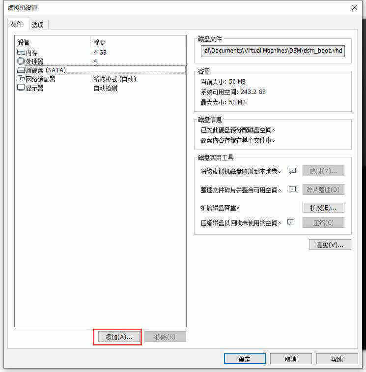 本教程在上面的步骤做到第5步的时候,建立的是虚拟硬盘,如果你想把另外一个硬盘整个全部给群晖使用,可以采用直通硬盘的方法,如下图所示: