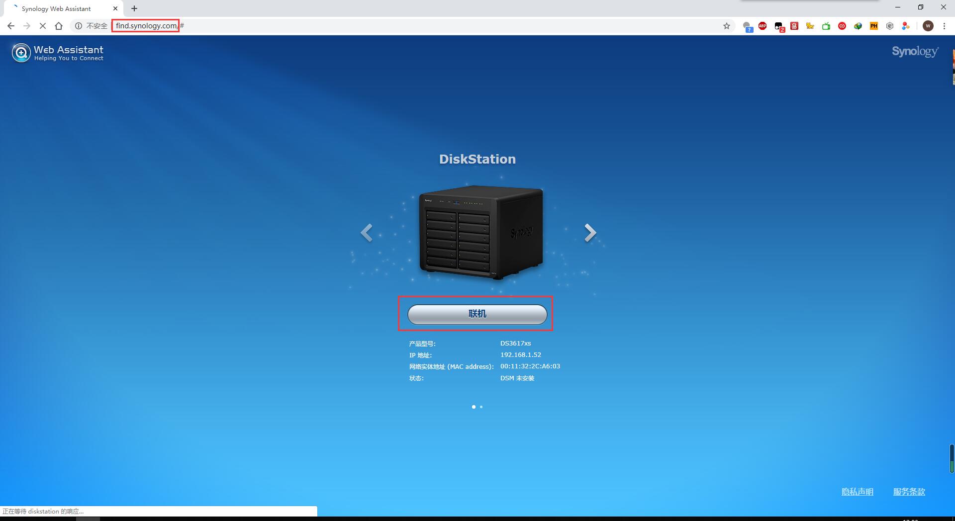 47、打开你的电脑浏览器,输入 http://find.synology.com/ ,稍等几分钟(根据电脑配置不同,等待的时间也不同),就会出现这个界面,点一下联机;