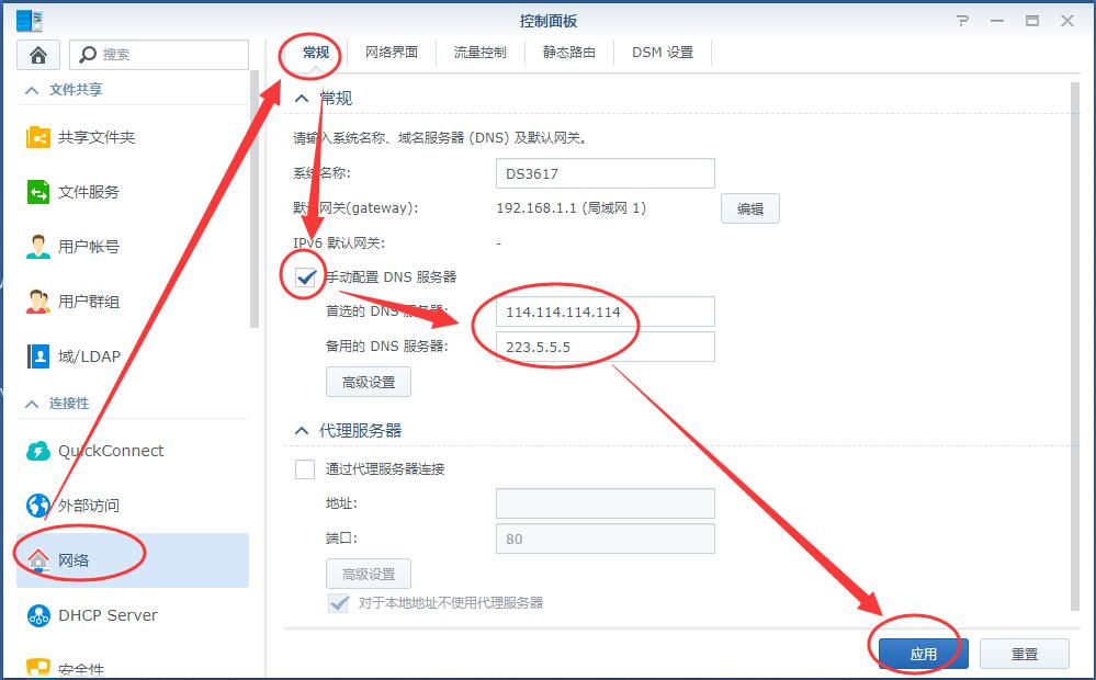 3、群晖控制面板-网络-常规,勾选“手动配置DNS服务器”,在首选的DNS服务器输入114.114.114.114,备用的服务器输入223.5.5.5,确定。