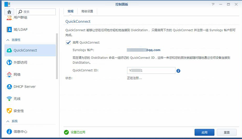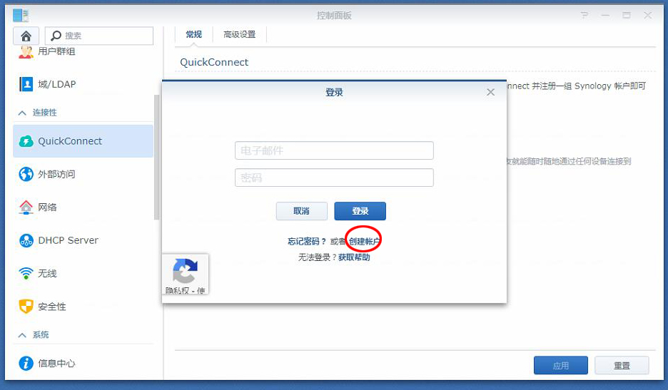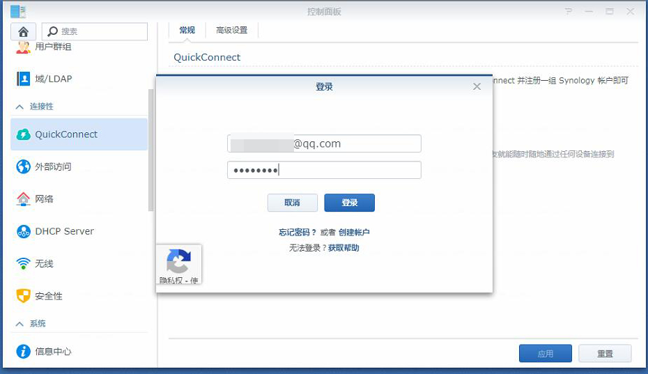 5、控制面板,QuickConnect,注册/登录。如果显示“无法连接到synology服务器”,则回去做第3步(DNS可以用别的,请百度:公共DNS)和第4步以后再回来登录。