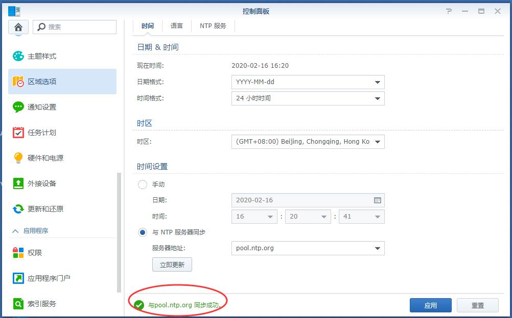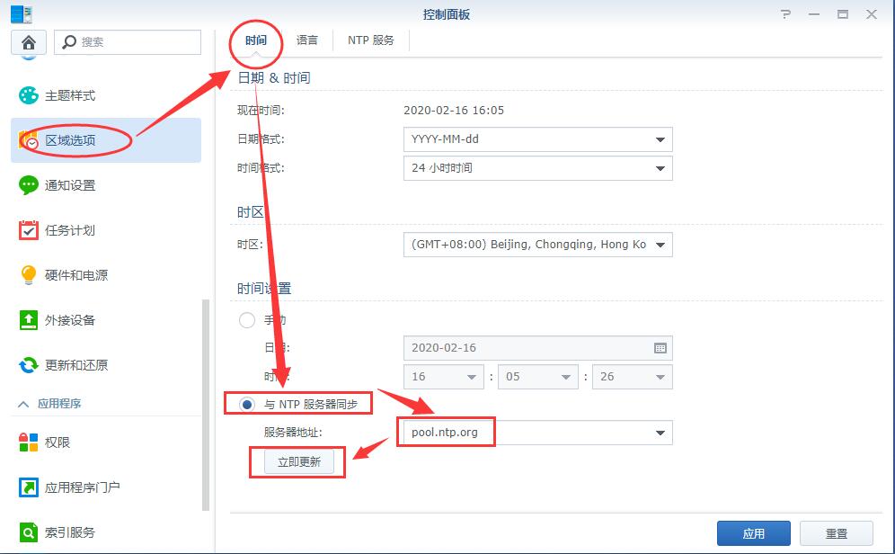 4、控制面板,区域选项,时间,在最下方的“与NTP服务器同步”,点一下立即更新,网络正常的话会提示同步成功(如果网络不正常,同步会失败);