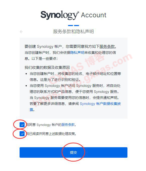 9、在“我同意 Synology 账户的服务条款”和“我已阅读并同意上述数据处理政策”两处打勾,提交;