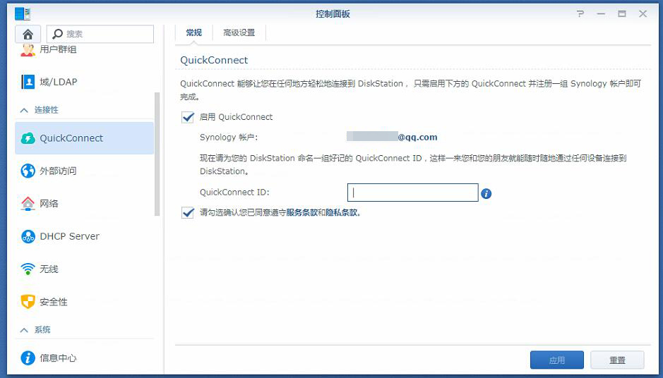 9、勾选“启用QuickConnect”和“请勾选确认您已同意遵守服务条款和隐私条款”;