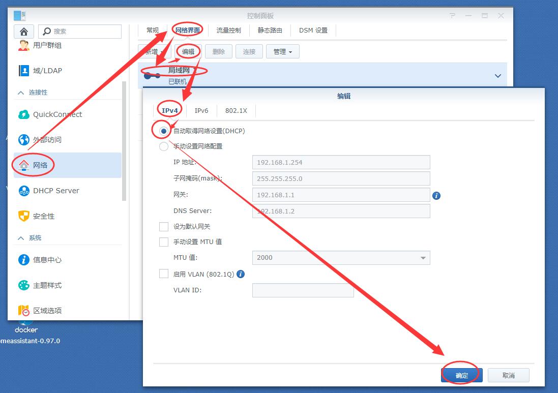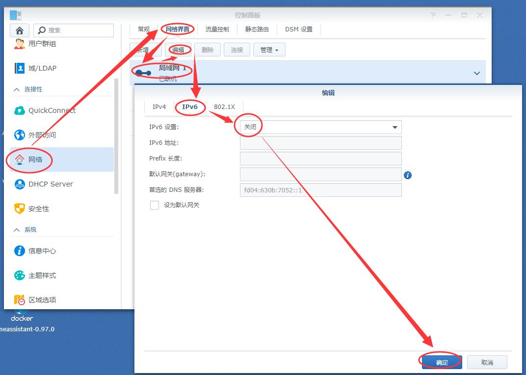 2、群晖控制面板-网络-网络界面,点一下“局域网1”,编辑,在“IPv4”选中“自动取得网络设置(DHCP)”,在IPv6-IPv6设置,选择“关闭”,确定。