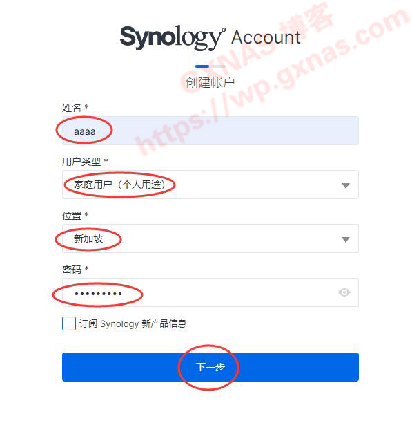 (4)密码:这个是设置群晖官网synology账户的密码,并非邮箱密码,也不是你安装群晖时设置的登录密码,不要搞混淆了。密码要求大写英文+小写英文+数字的组合,长度8位或者以上。