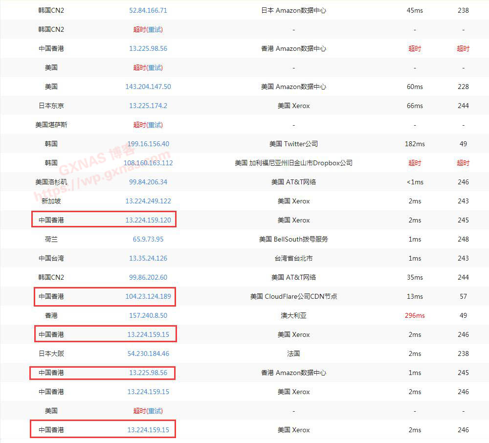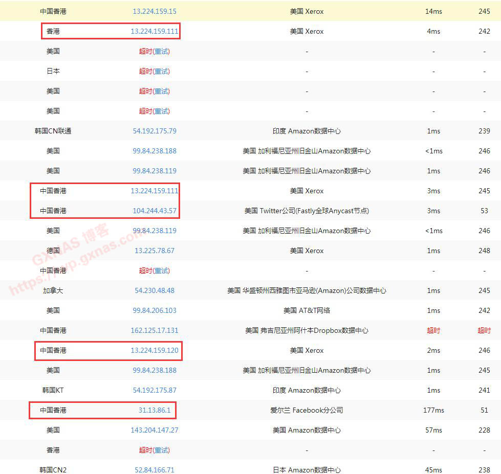 6、既然国内都访问不了,那么就需要找一个离我们相对比较近的地方,并且响应时间比较快,比如下图香港的这几个IP,找个记事本把这些IP地址复制出来;