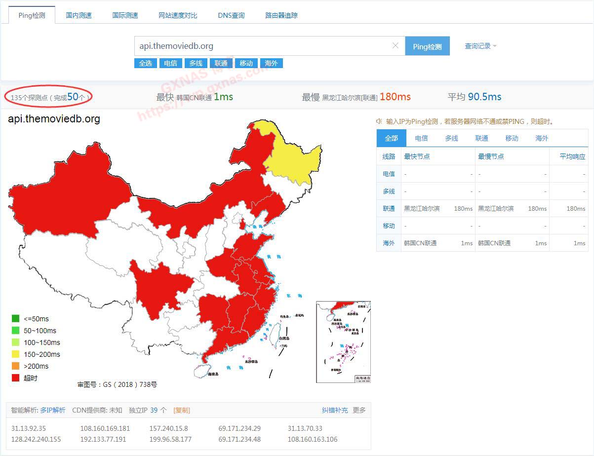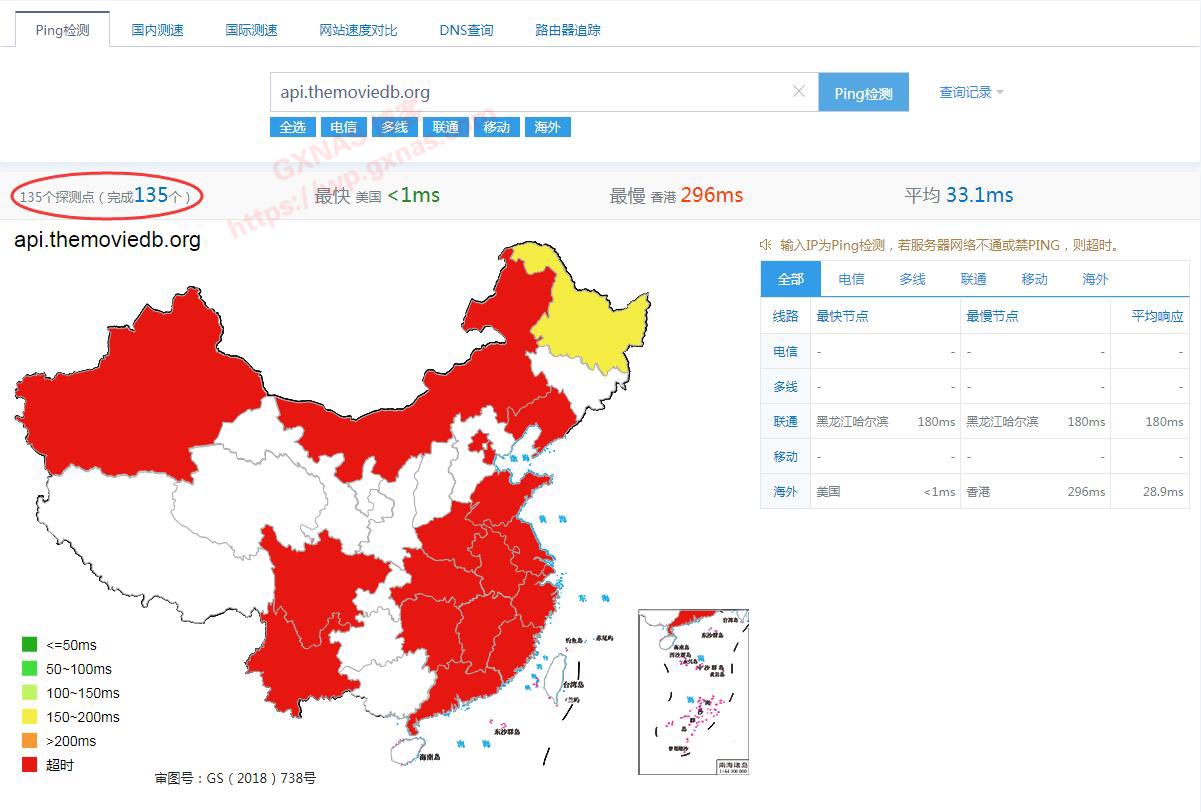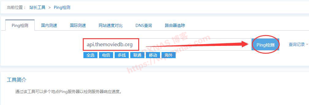 2、在输入框中输入api.themoviedb.org,点Ping检测;