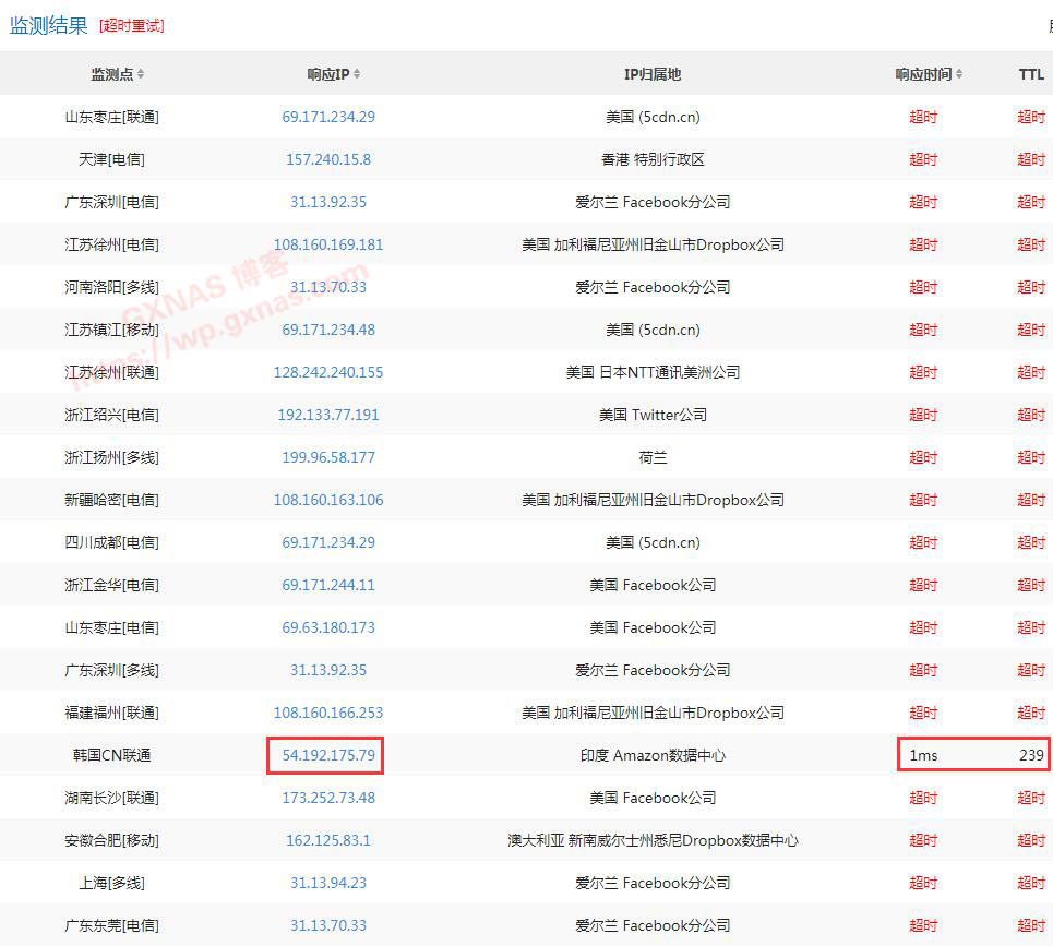 5、继续向下滑动,看到国内这些地方显示的响应时间均为超时,偶尔在别的地方还可以访问,继续向下滑动;