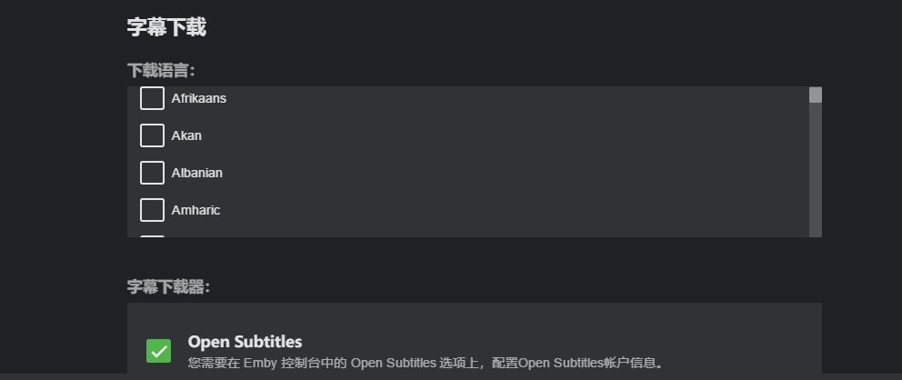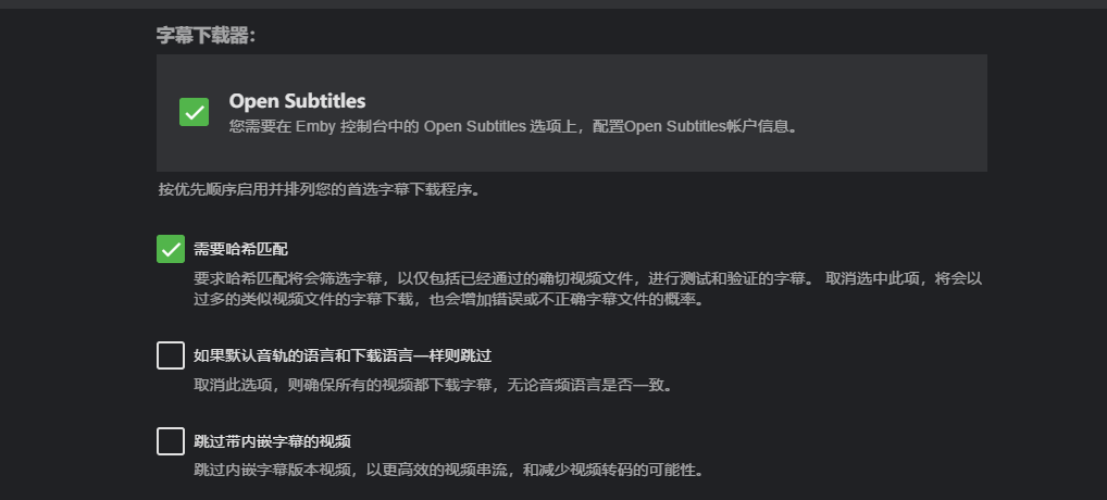 字幕下载需要配置Open Subtitles字幕网站,需要有Open Subtitles帐号才可以下载,而且下载的字幕也都不准,适合英文区的用户,中文区不需要这东西,直接去字幕库下载后,单体添加即可。