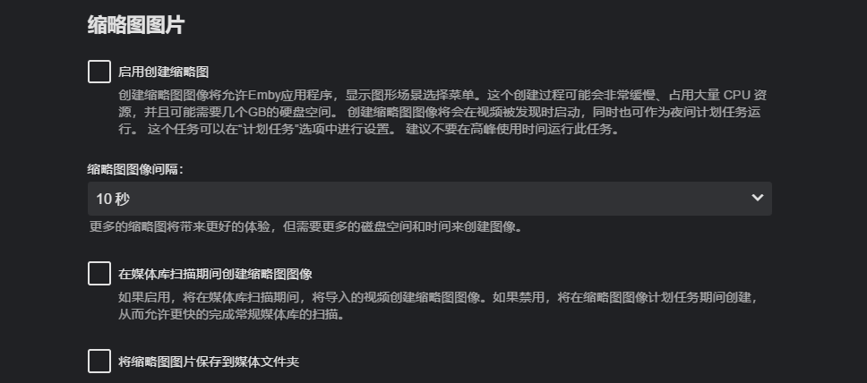 缩略图图片,这个不需要开启,就是显示个过场章节而已,以前是占用很大的空间,现在是一部电影最大占用5MB左右的空间,但是电影多了,也受不了,所以不建议开启。