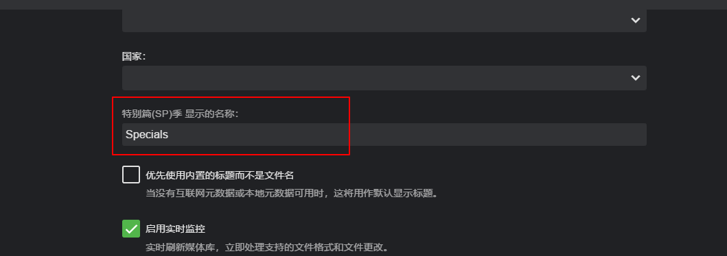 首选是 特别篇(SP)季 显示的名称: 默认是Specials,英文的意思有很多,但是在电视节目当中,比如美剧里面算是特别篇,日本动漫里面就算作很多了,比如OVA OAD SP 特典 番外篇 等等,这个名称你可以自己自定义显示,比如我设置的是特别篇。