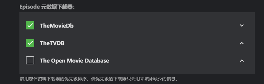 Episode 元数据下载器: Episode 是集的意思,也就是剧集中的每一集信息等,默认还是把 TheMovieDb 设置到第一位。