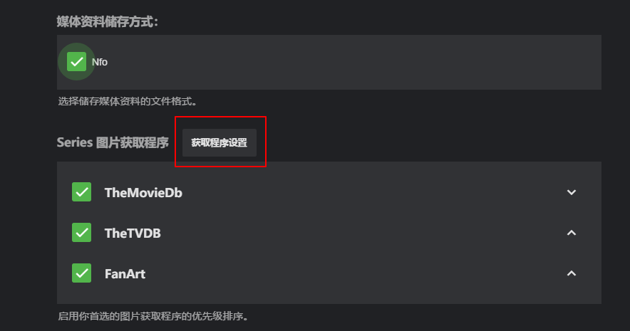 然后下面的就是系列,季,集,这三种类型的图片优先级下载和其他的下载设置,总之这些默认始终都是 TheMovieDb 设置到第一位即可,其他的无所谓。