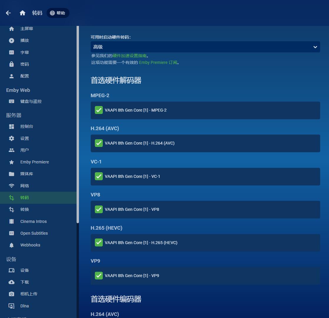 2、在EMBY的转码里面,把“可用时启动硬件转码”选择“高级”(此功能需要有EMBY会员),同时把所有的硬件解码器打勾;