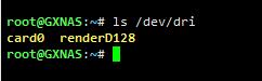 再回来说一下群晖的视频播放,很多人都想用上硬件解码,怎样才算用上硬件解码呢?首先,你的cpu要有核显,在Win系统用Xshell以root用户登录群晖SSH状态下,输入ls /dev/dri,看到有 card0 renderD128字样的,恭喜你可以使用硬件解码: