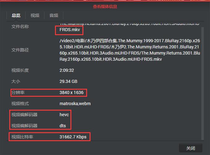 2、视频编码为hevc+dts,分辨率为4K,文件格式为mkv;